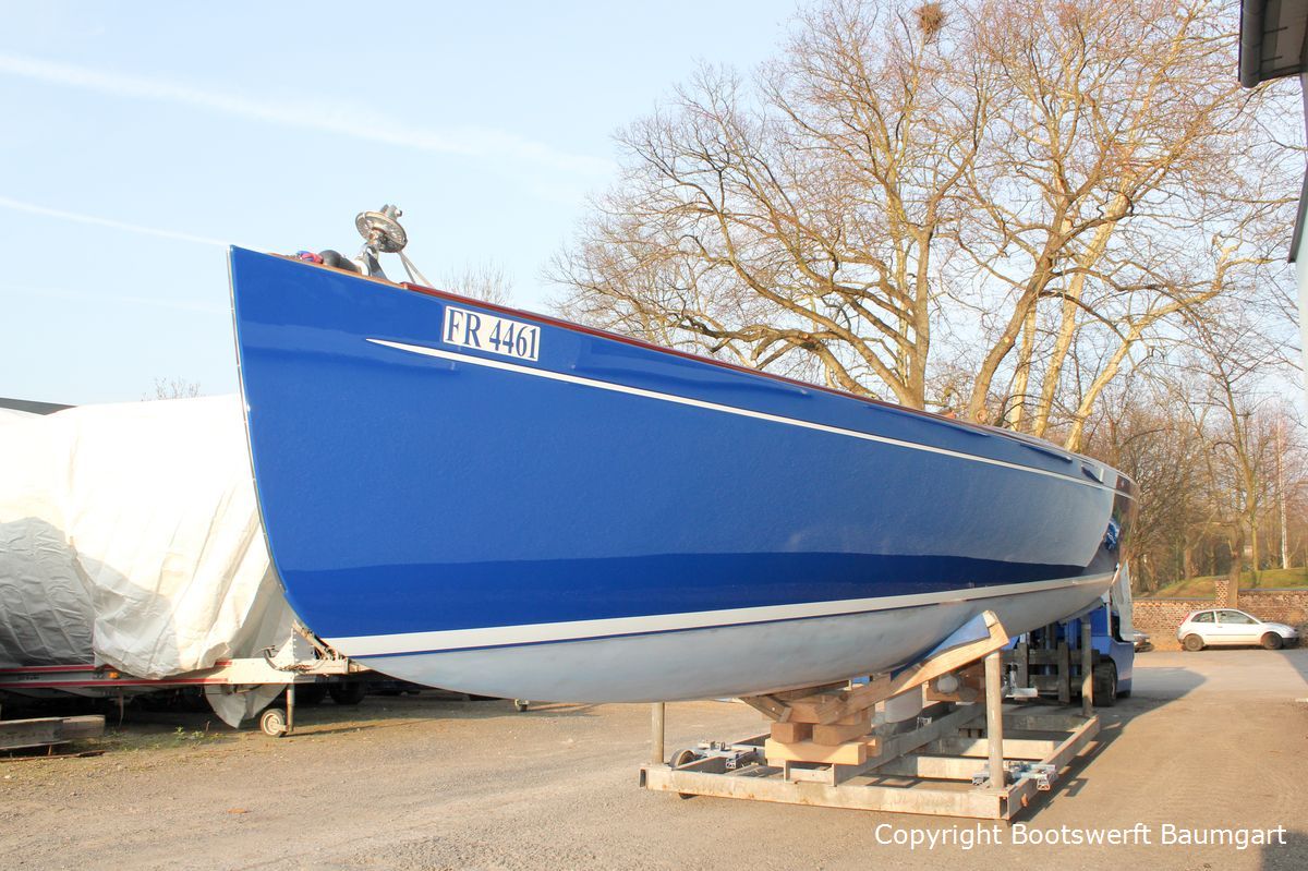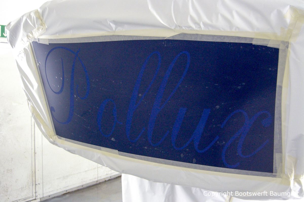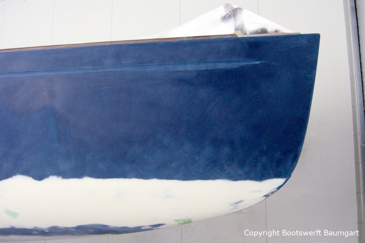 - Die Bordwände werden nun in der Lackierhalle mit AWL Grip Yachtfarben in Royal Blue lackiert